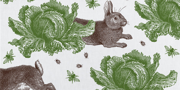A favourite at Thornback & Peel, our original Rabbit & Cabbage print takes you on a whimsical journey to the bottom of Mr McGregor’s garden. Conjuring up the chocolatey brown and vivid green of the vegetable patch, the lazy buzzing of insects on a summer’s afternoon, and the delights of the English country garden.