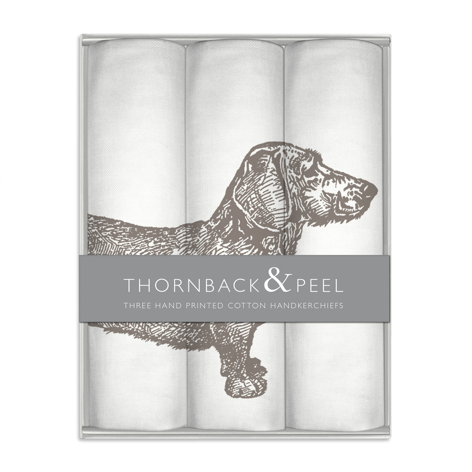 Three white cotton handkerchiefs hand printed with a grey dachshund. Beautifully presented in a gift box.