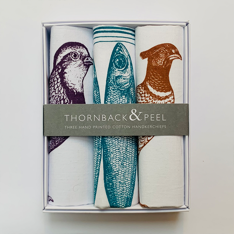 Three white cotton handkerchiefs hand printed and beautifully presented in a gift box