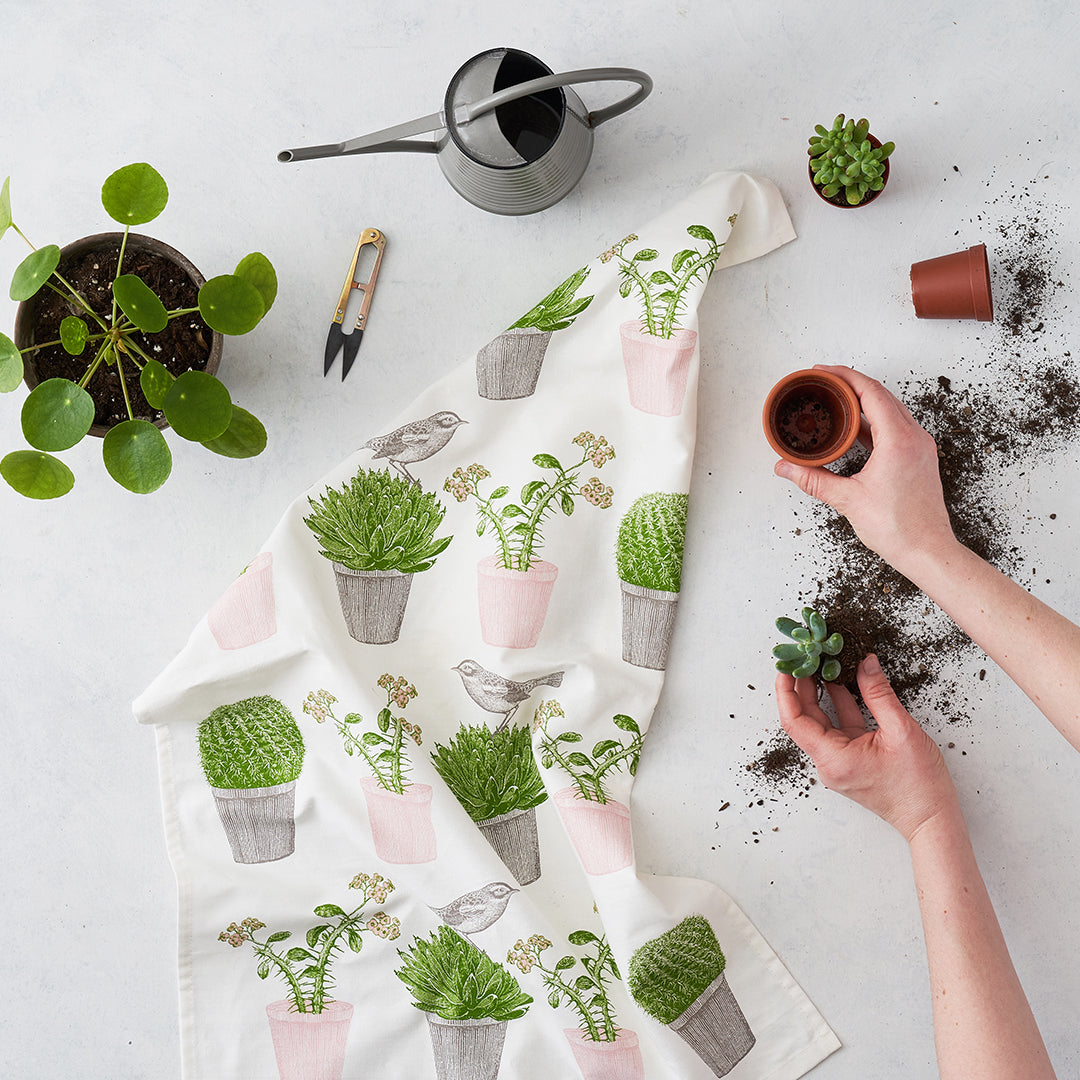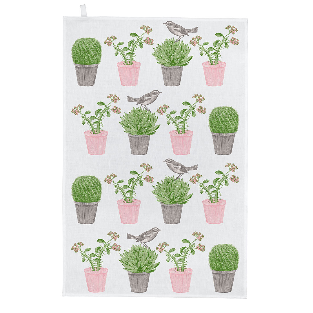 100% White cotton tea towel, screen-printed with a fabulous three colour Cactus & Bird design. The perfect kitchen addition for house-plant lovers.